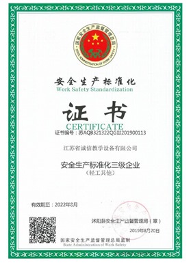 江蘇省誠信教學設備有限公司成立于2003年,是一家專注教學設備研究開發、生產制造、銷售服務為一體的綜合性教育、服務型企業,是江蘇省教育設備行業協會會員單位、中國教育裝備行業協會會員單位,公司先后通過ISO9001國際質量管理體系認證、IS14001國際環境管理體系認證、OHSAS18001職業健康安全管理體系認證。數十年的激勵前行鑄就企業優質的產品品質和服務質量。